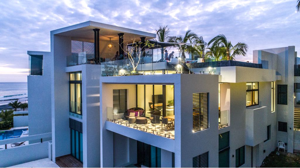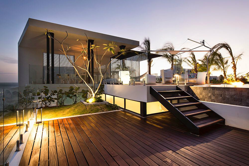 Pool and ocean merge and an in-pool fireplace dazzles on this rooftop installation.