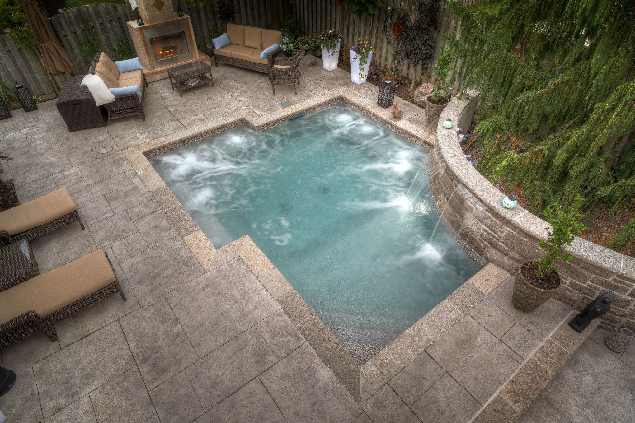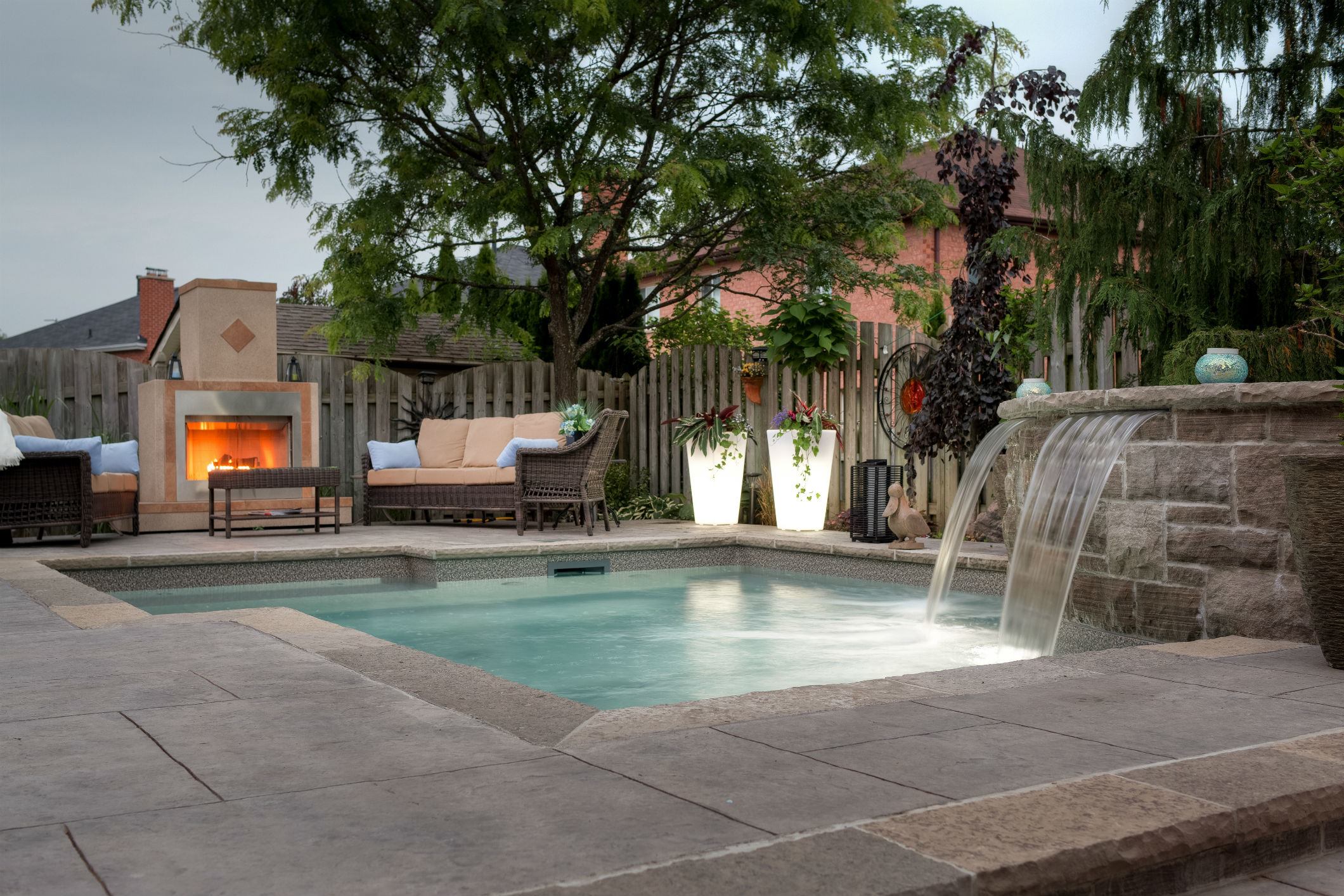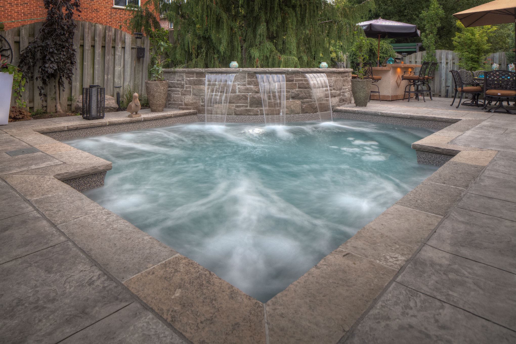 Root cause: Luff carefully designed the outdoor living area around a handsome Siberian spruce that sits dead-center in the yard. “What I wanted to do is have their living space from the east part of the yard meet with the water on the west part of the yard, and have that tree as the focal point,” Luff said. To achieve this, the designer erected a 3-foot-high semicircle wall with sheet waterfalls around the tree. This required a custom radius panel for the corner of the pool/spa below the natural stone wall. Wiarton ledgerock was chosen for the wall because it is native to the area.