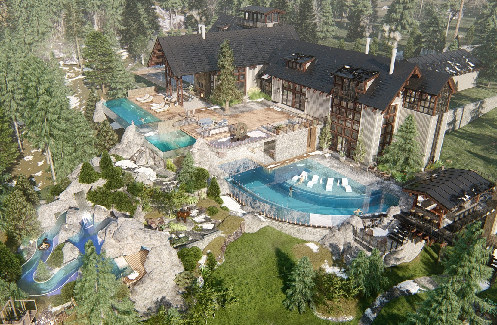 The design needed to meet several criteria, including that it blend with the hybrid rustic/modern industrial home, frame the views, enable lap swimming; accommodate up to 25 people for parties, and include: a spa that seats 8 to 10; fire-and-water elements; a waterslide; spaces to showcase outdoor sculptures and other art; an outdoor kitchen; bunkhouse; and access to the lake below.