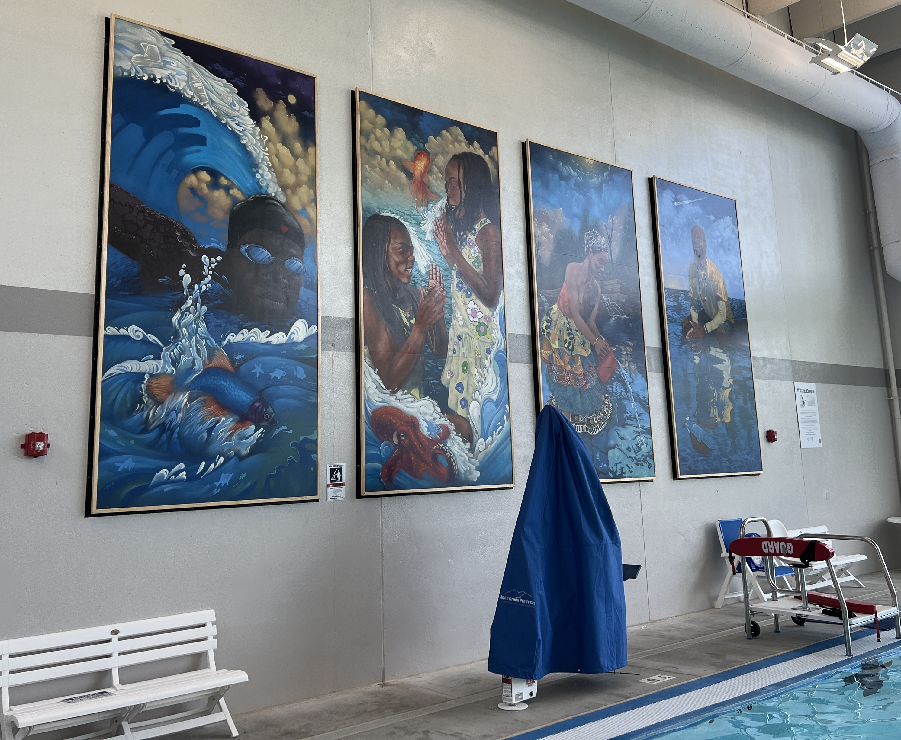 Behind the pools hangs a four-piece mural commissioned especially for the center. By Nashville artist Woke3, it conveys people’s deep connection with water and its significance beyond physical survival. The artist depicted citizens of the city to ground it in community, while sea life reminds visitors that water ties the planet together. Each of the four panels contains a hidden heart to represent the heart of the country.