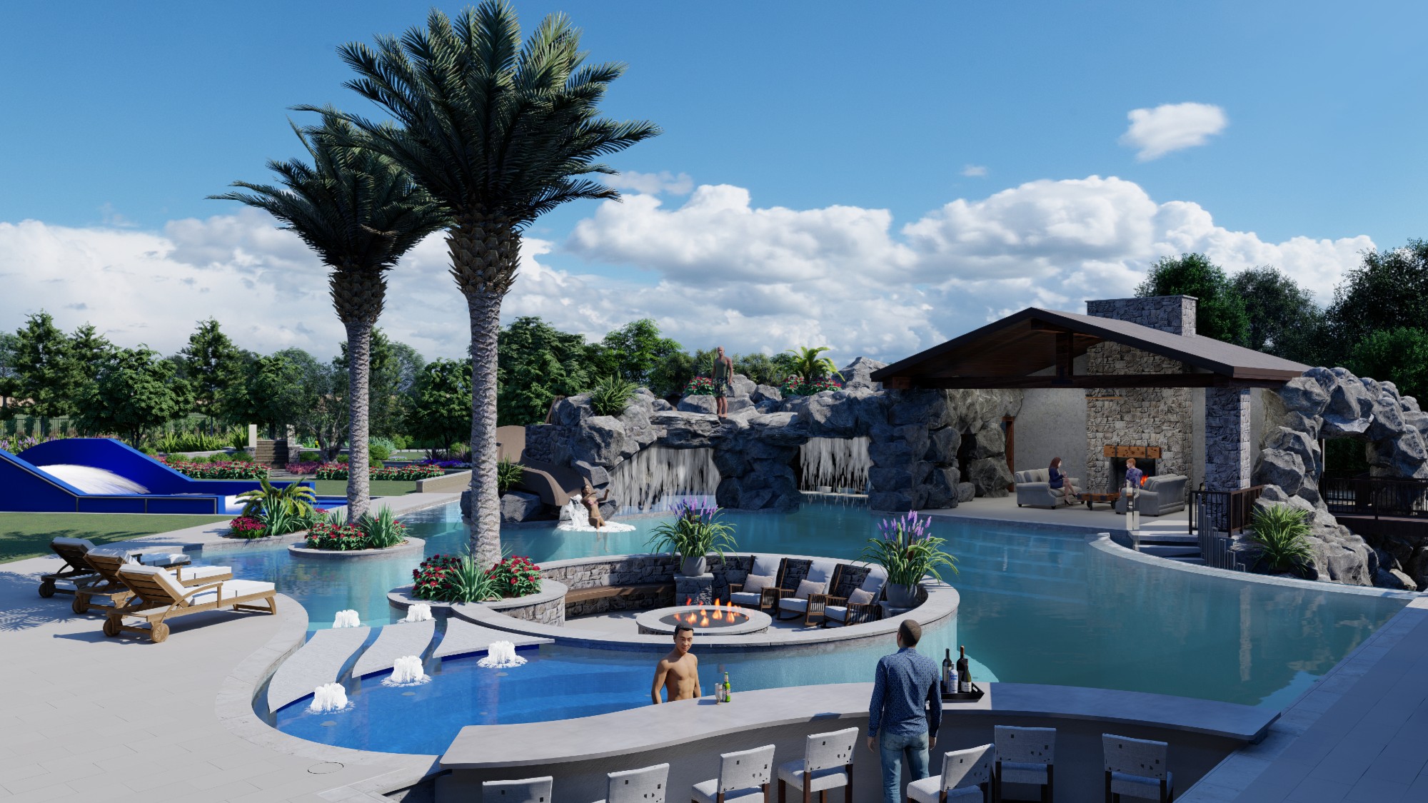 The main pool features a sunken firepit, swim-up bar, planter island, and pavilion. Besides that, the yard has several components that transform the yard into a residential waterpark resort: