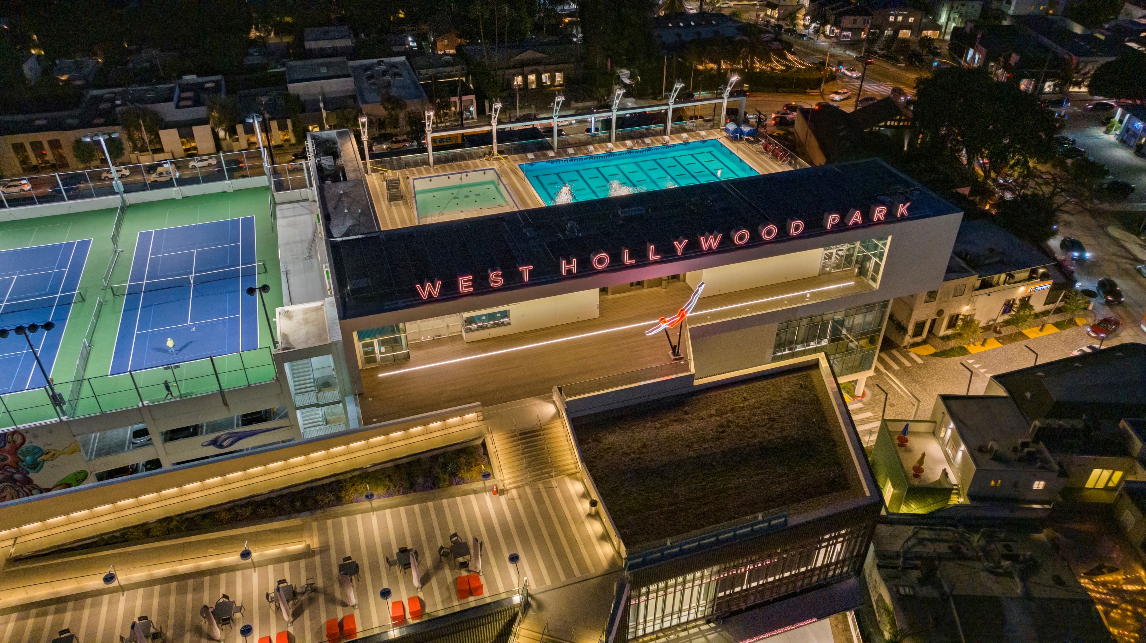 Given that final fact, officials from the City of West Hollywood had no interest in a closed-in natatorium. A set of rooftop pools provided the answer, offering fun and sun in a minimal footprint, all while leveraging iconic city views, including the Hollywood Hills directly north and downtown Los Angeles about 10 miles southeast. Eclectic artwork, bold colors and inclusive amenities such as family-style restrooms welcome visitors from all backgrounds and orientations.